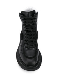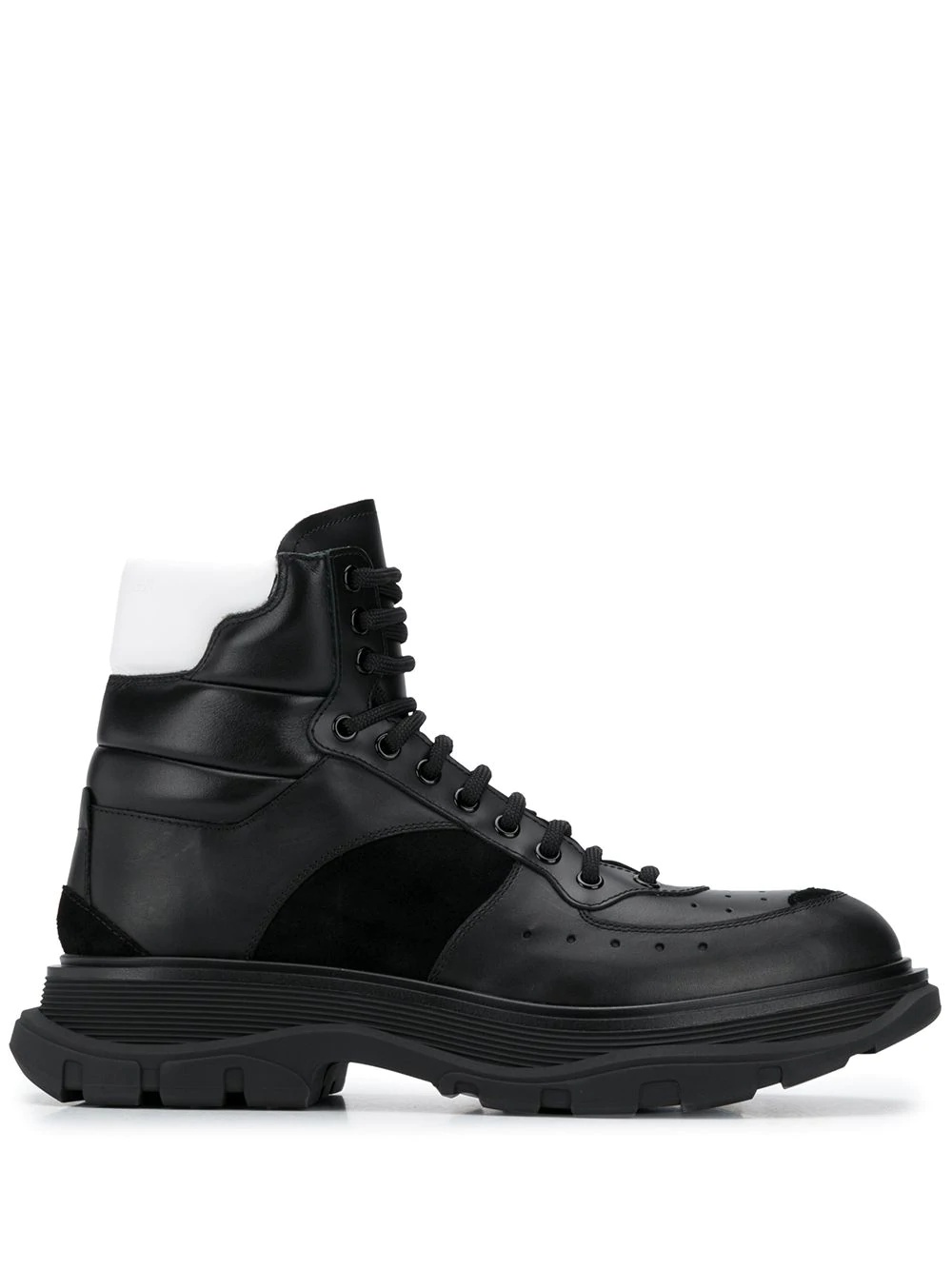 lace-up high-top sneakers Step out in style. These high-top sneakers from Alexander McQueen are sure to be the focal point of your look. Put your best foot forward. Highlights - Black/white - Calf leather - Contrasting heel counter - Panelled design - Round toe - Front lace-up fastening - Ankle-length - Chunky rubber sole Made in Italy Composition Outer: Calf Leather 100% Lining: Leather 100% Sole: Rubber 100% SIZE & FIT Measurement HEEL 2.4 in(6 cm) HEIGHT 5.1 in(13 cm) Sole height 1.6 in(4 cm)