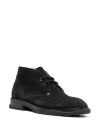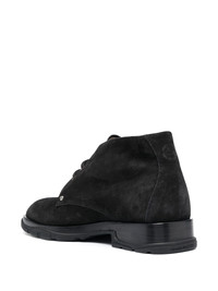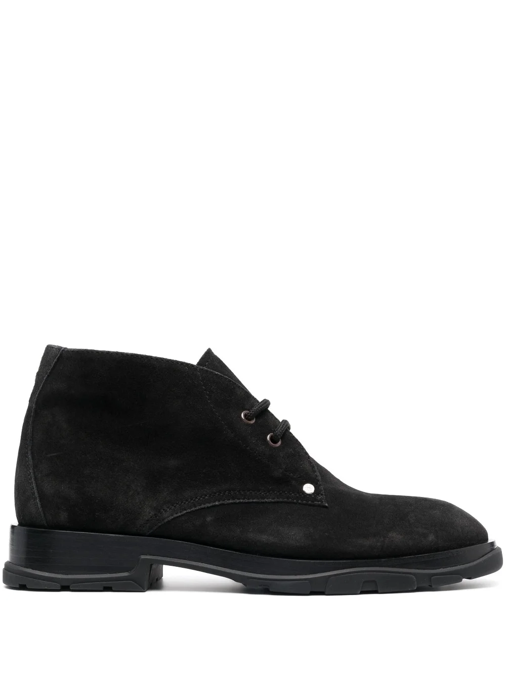 lace-up suede boots Alexander McQueen updates the classic ankle boots. In a nod to the house's modern spirit, this iteration combines a leather sole with a branded rubber ridged sole. Highlights - Black - Calf suede - Logo at the sole - Front lace-up fastening - Ankle-length - Branded heel counter - Ridged rubber sole Made in Italy Composition Sole: Rubber 100% Lining: Calf Leather 100% Outer: Calf Suede 100% SIZE & FIT Measurement HEEL 1.37 in(3.5 cm) HEIGHT 4.33 in(11 cm) Sole height 0.78 in(2 cm)