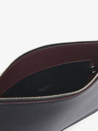 The McQueen Large Sling zip pouch – asymmetrical and crafted from black grainy calf leather with contrasting oxblood edge paint and featuring a central zip compartment, an internal flat pocket with D-ring and six card slots. Finished with a rounded right corner mirroring the T-Bar Sling bag. Product details - Dimensions: Length 31 x Height 20 x Depth 0.1 cm / 12.2 x 7.8 x 0.03 inches - One central zip compartment - Six card slots - Flat pocket with metal D-ring - McQueen metal lettering - Product code: 8148501VDCC1000 - Made in Italy - Material: Calf Leather