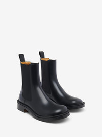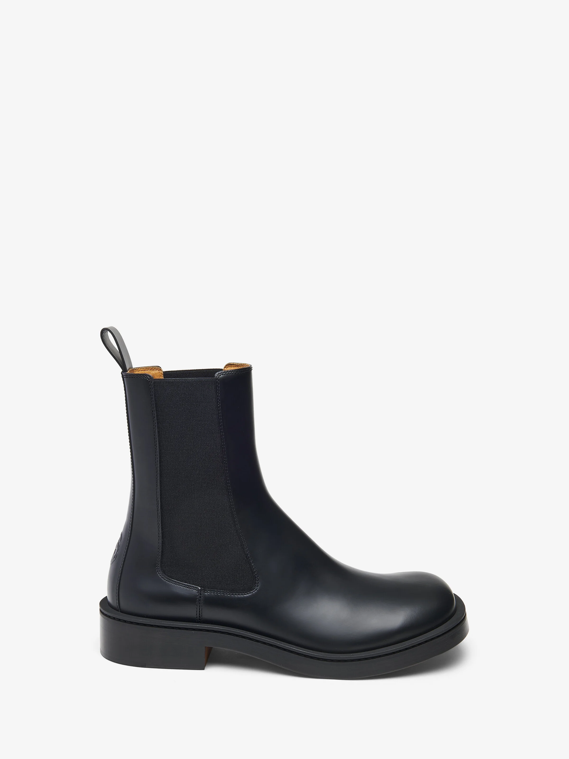 The Trunk Chelsea boot – shiny black calf leather with a round toe silhouette and a stacked sole. Finished with an embossed inverted skull heel detail. Product details - Round toe - Elasticated side panels - Pull tab - Sole height: 40mm / 1.5 inches - Product code: 809946WIACN1000 - Made in Italy - Material: Calf Leather