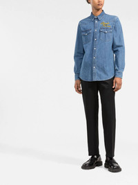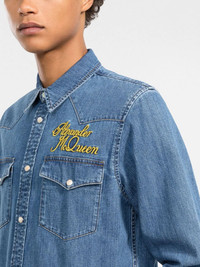 logo-embroidered denim shirt Alexander McQueen presents its take on the denim shirt with this blue long-sleeved shirt. Designed with an embroidered logo at the chest, this piece features a relaxed straight cut with two button fastening chest pockets. Highlights - Medium blue - Cotton - Denim - Classic collar - Long sleeves - Press-stud fastening cuffs - Embroidered logo at the chest - Two chest flap pockets - Curved hem - Front press-stud fastening Made in Italy Composition Outer: Cotton 100%, Polyester 100% Lining: Polyester 65%, Cotton 35% SIZE & FIT Model measurements Height 6 ft 2 in(1.88 m) Bust/Chest 36.61 in(93 cm) Hips 35.82 in(91 cm) Waist 27.95 in(71 cm) FittingInformation Designed for a relaxed fit, this piece allows for comfort and movement when worn Made from a midweight non-stretch fabric This piece fits true to size – take your usual size Washing instructions Machine Wash