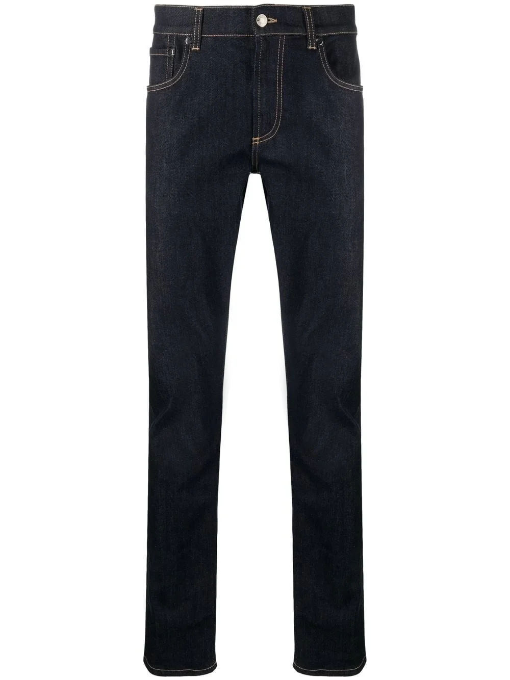 straight-leg denim trousers blue stretch-cotton denim contrast stitching front button and zip fastening classic five pockets straight hem Made in Italy Composition Outer: Polyester 100%, Cotton 98%, Elastane 2% Lining: Polyurethane 100%, Polyester 65%, Cotton 35% SIZE & FIT Model measurements Height 6 ft 1 in(1.85 m) Bust/Chest 31.88 in(81 cm) Hips 33.07 in(84 cm) Waist 26.77 in(68 cm) FittingInformation This piece fits true to size. We recommend you get your regular size Cut for a slim fit Made with a mid-weight stretch fabric Washing instructions Machine Wash