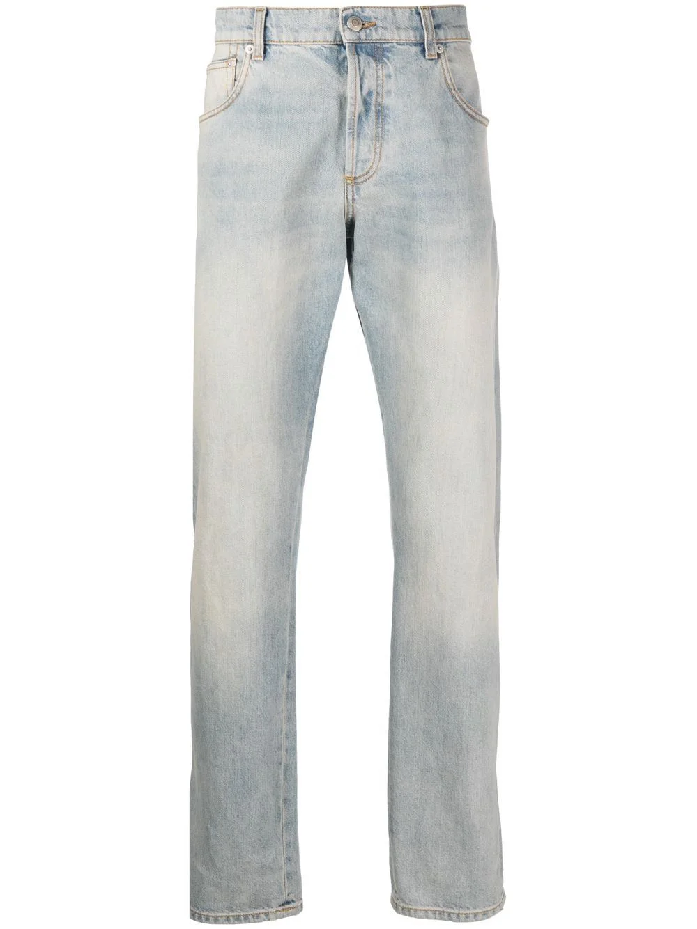 logo-patch washed cotton jeans light blue cotton washed denim logo patch to the rear straight leg front button and zip fastening belt loops classic five pockets ankle-length Made in Italy Composition Outer: Cotton 100%, Calf Leather 100% Lining: Polyester 65%, Cotton 35% Washing instructions Machine Wash