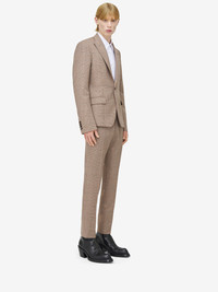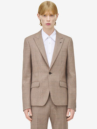 Single-breasted jacket in beige, black and chestnut London Check light twill. Peak lapels, chest pocket and two side flap pockets. Finished with a T-Bar chain back detail. Complete the look with the matching trousers. Product details - Peak lapels - Side flap pockets - Single button fastening - Made with certified wool yarn - Product code: 805885QUACN2118 - Made in Italy - Material: 100% Wool