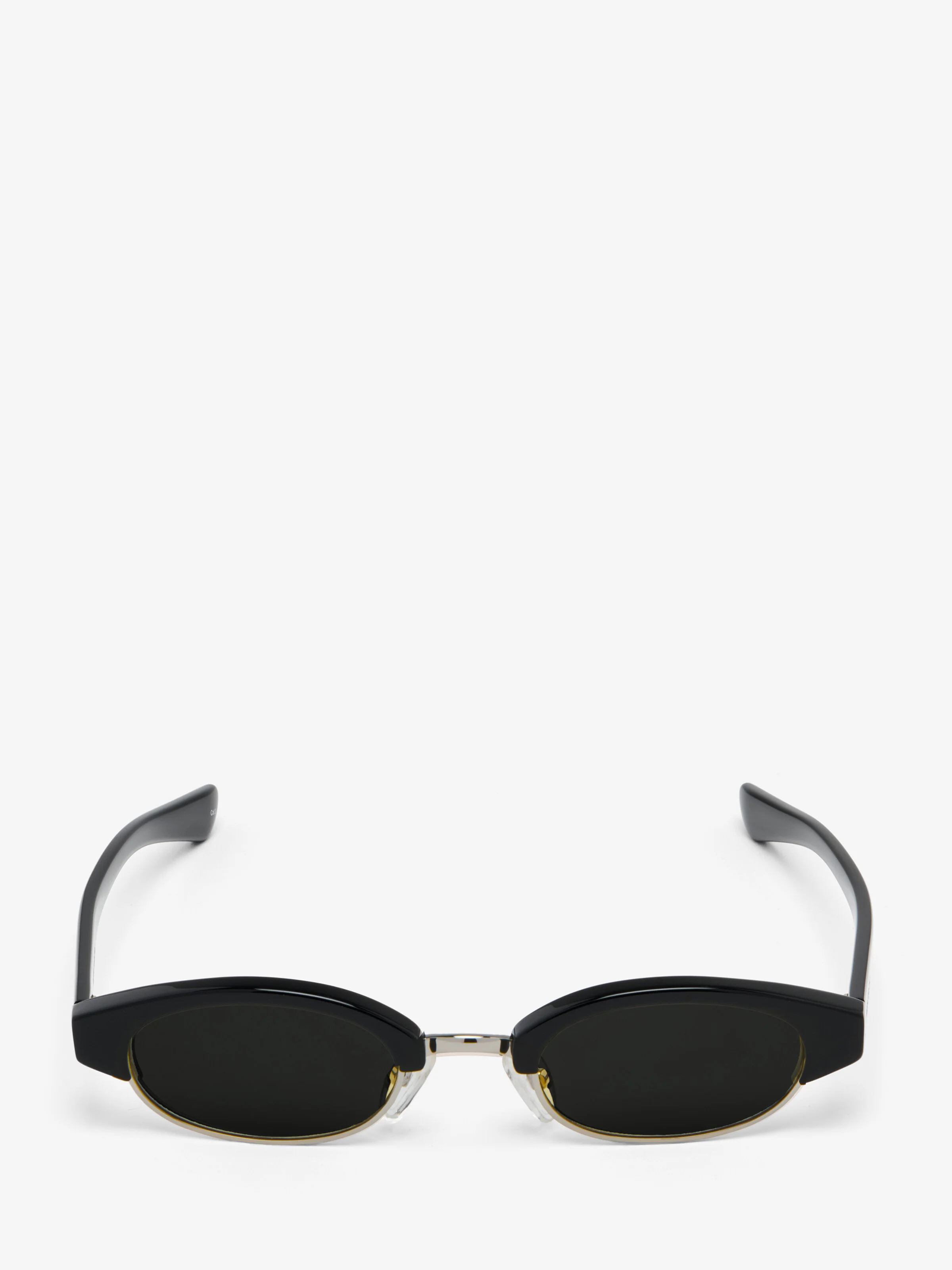 Black acetate sunglasses fitted with solid smoke lenses. The sunglasses feature a narrow oval shape with a half-rim construction and adjustable nose pads. The temples are detailed with a lasered McQueen logo. All McQueen Eyewear is 100% certified UV protective (UVA and UVB rays). Product details - The Eastman Acetate Renew used in this style includes 27% recycled material achieved via mass balance approach. - The style can be fitted with prescription lenses. - Product code: 841557J07491056 - Made in JAPAN - Material: Recycle Acetate & Bio Nylon Lens