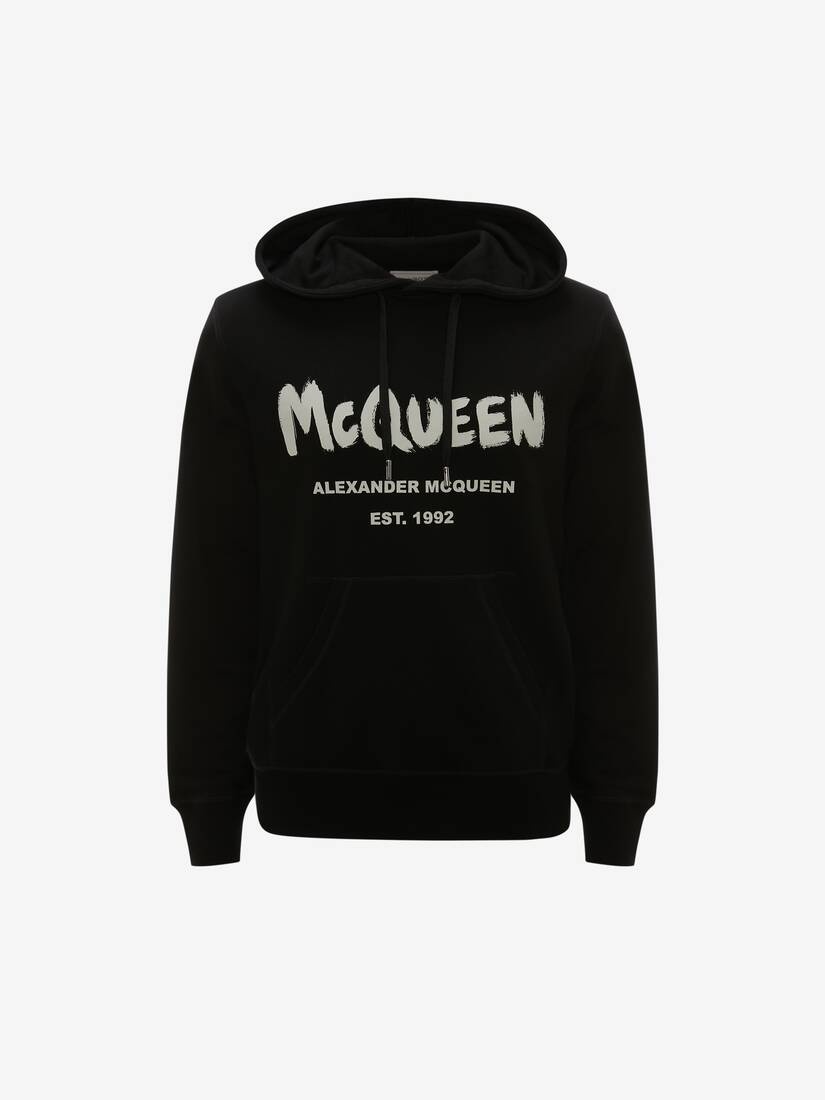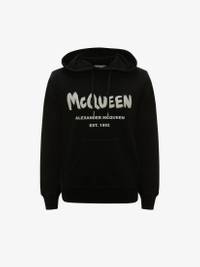 Black loopback jersey hooded sweatshirt with a screen printed McQueen Graffiti logo. The sweatshirt has a front pocket and a drawstring hood. Finished with ribbed cuffs and hem. Material:100% Cotton Product Code:688715QSZ810901