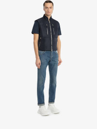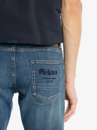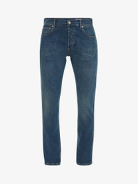 Blue washed stretch denim slim fit jeans with an embroidered McQueen Graffiti signature on the back pocket. Five-pocket design, finished with tobacco top-stitching. Material:98% Cotton, 2% Elastan Product Code:666650QTY344001