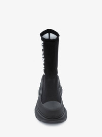 Black boot featuring a ribbed knit sock upper finished with a white McQueen Graffiti signature and an oversized rubber tread sole. The boot is detailed with a textured rubber wrap and tonal Alexander McQueen signature. Round toe shape boot silhouette details rubber toe cap. Material:100% Viscose Product Code:705671W4TV11070