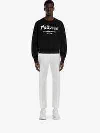 Black cotton loopback jersey sweatshirt with a white McQueen Graffiti logo motif. The logo is a combination of embroidery and screen print. The style features crew neck with ribbed cuffs and hem. Oversize fit with drop shoulders. Product Details: - Made with organic cotton jersey Material:100% Cotton Product Code:701285QTZ110901