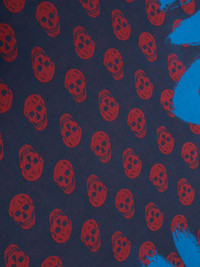 McQueen Graffiti printed frayed scarf Injected with a punk sensibility reflecting the house's aesthetic, this two-tone modal scarf reinterprets the brand's iconic skull-print foulards, overlapping the cadaveric motif with the signature Graffiti logo stamp. Fraying along the edge rounds it out. Highlights - Navy blue/dark red - Modal - Skull print - Signature graffiti print - Two-tone design - Striped border - Frayed edge Made in Italy Composition Modal 100% SIZE & FIT Measurement LENGTH 47.24 in(120 cm) WIDTH 47.24 in(120 cm) Washing instructions Dry Clean Only