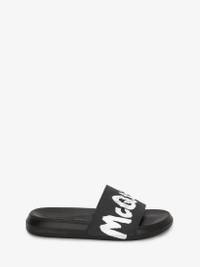 Black rubber slide with an embedded Alexander McQueen signature on the strap with McQueen Graffiti printed over the signature. The slide has a textured oversized rubber sole. Finished with a round toe silhouette. Material:100% Rubber Product Code:682490W4QS31070