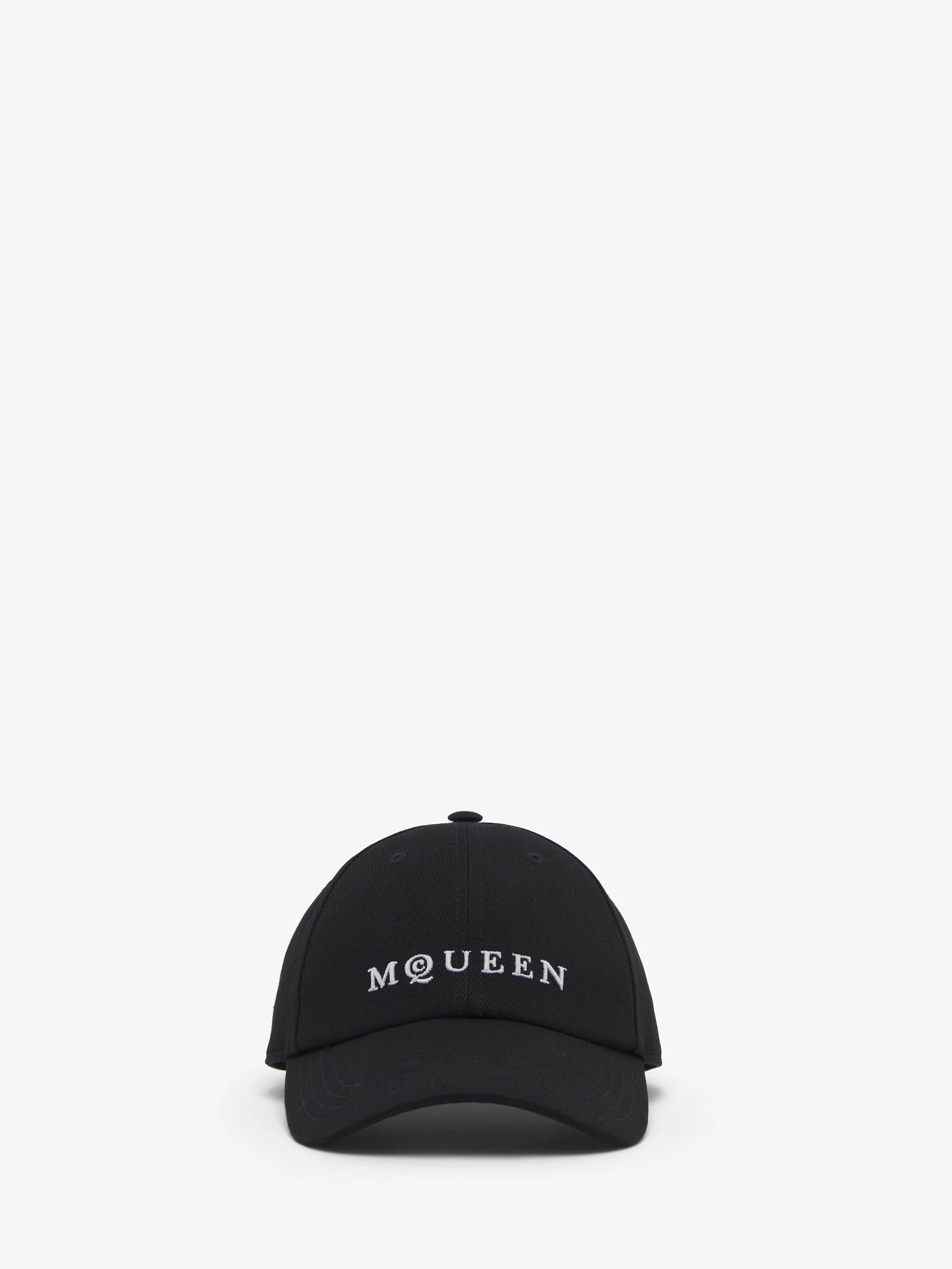 Black cotton denim baseball cap featuring an embroidered ivory McQueen logo on the front. The cap is finished with an adjustable leather closure at the back. Product details - Sizes: S to XL - Product code: 8281824105Q1078 - Made in Italy - Material: 100% Cotton