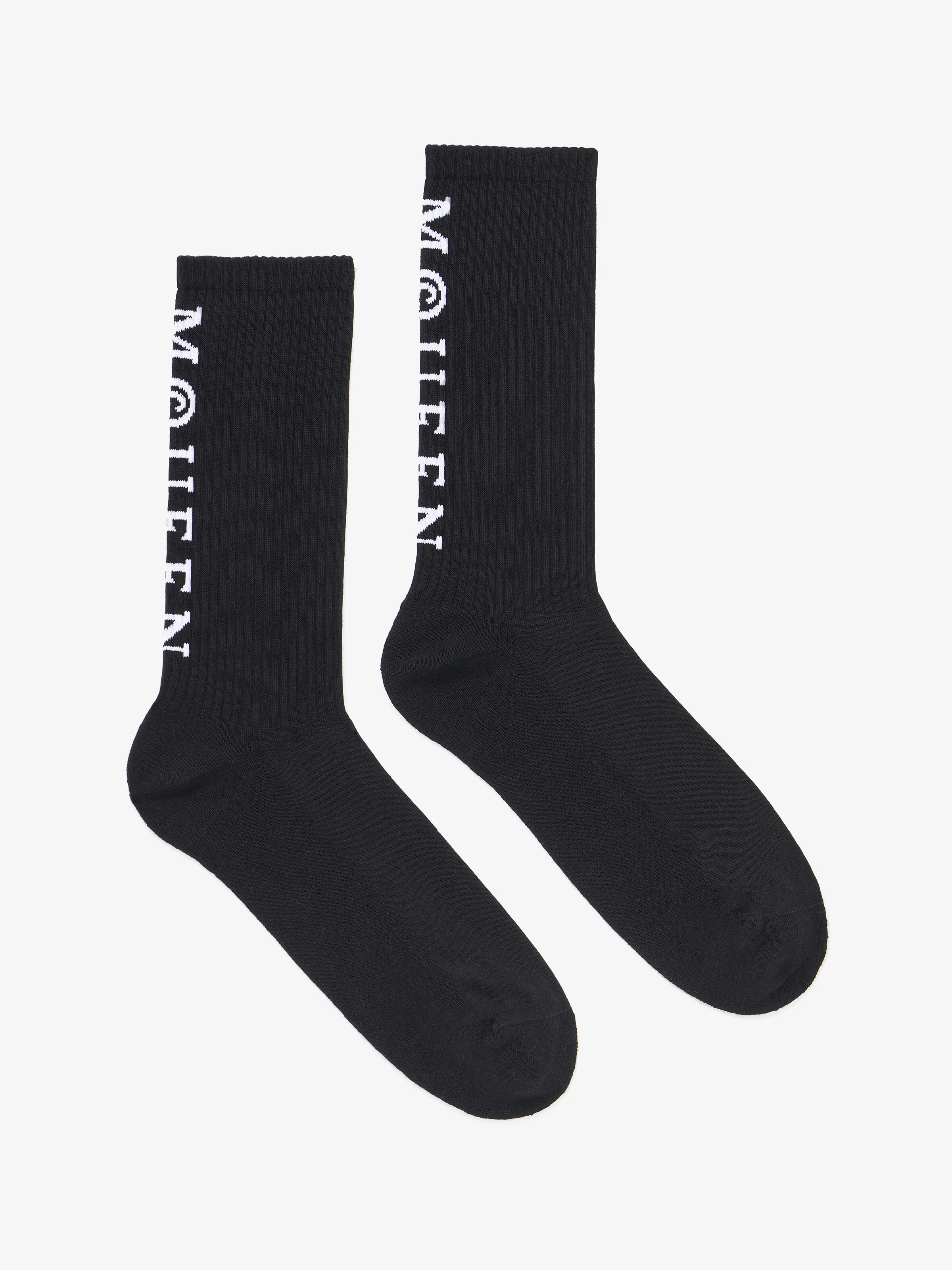Black socks in a cotton and nylon blend featuring a contrasting white McQueen logo. Product details - Sizes: M and L - Product code: 8375084720Q1077 - Made in Italy - Material: 74% Cotton, 23% Polyamide, 3% Elastane