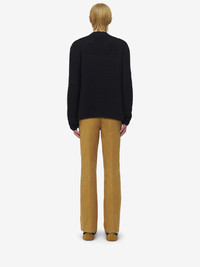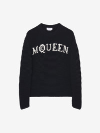 Crew neck jumper. Black textured cotton with an ivory McQueen logo intarsia on the front. Finished with a ribbed neck. Product details - Crew neck - Long sleeves - Product code: 829319Q1BDL1080 - Made in Italy - Material: 100% Cotton