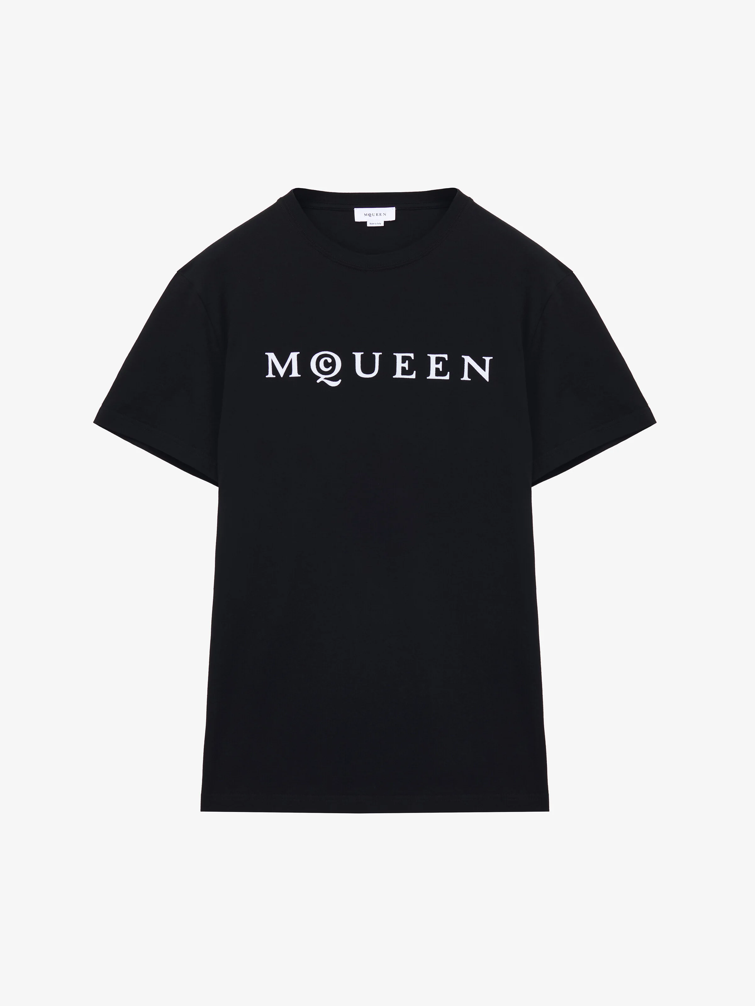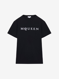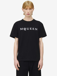 Black cotton jersey crew neck T-shirt featuring a McQueen logo. Product details - Product code: 828420QTADD0520 - Made in Italy - Material: 100% Cotton