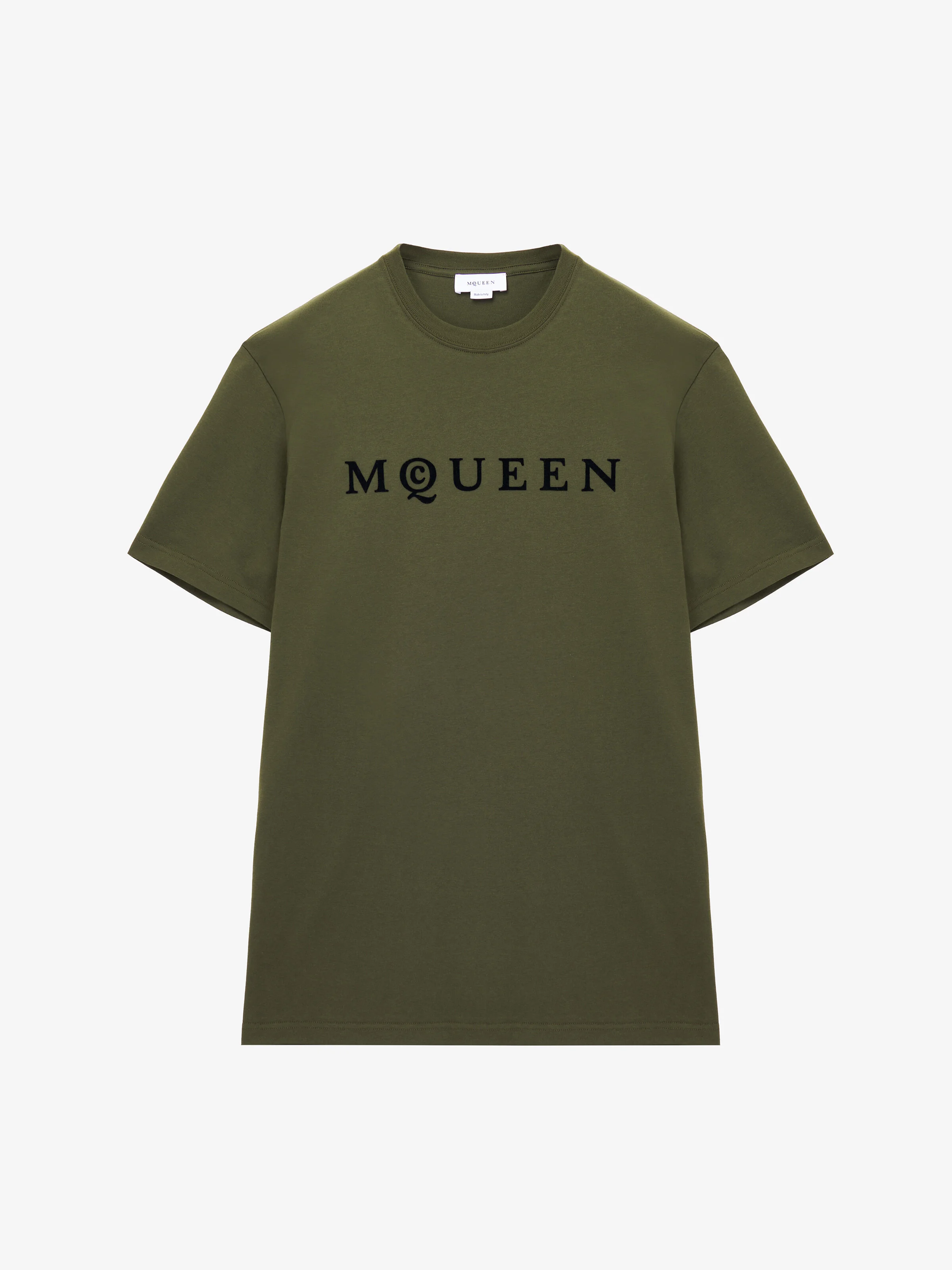 Khaki cotton jersey crew neck T-shirt featuring a McQueen logo. Product details - Product code: 828420QTADD0308 - Made in Italy - Material: 100% Cotton