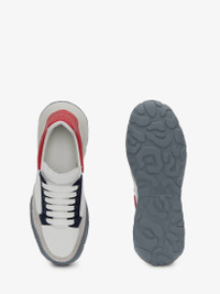White leather lace-up Court Trainer with grey and navy blue suede trims and a welsh red heel counter. The trainer features large flat laces and a bi-colour lightweight signature leopard rubber sole. Finished with an Alexander McQueen signature on the tongue and heel counter. The trainers come with an additional set of shoelaces. Material:100% Calf leather Product Code:705117WIAAC8990