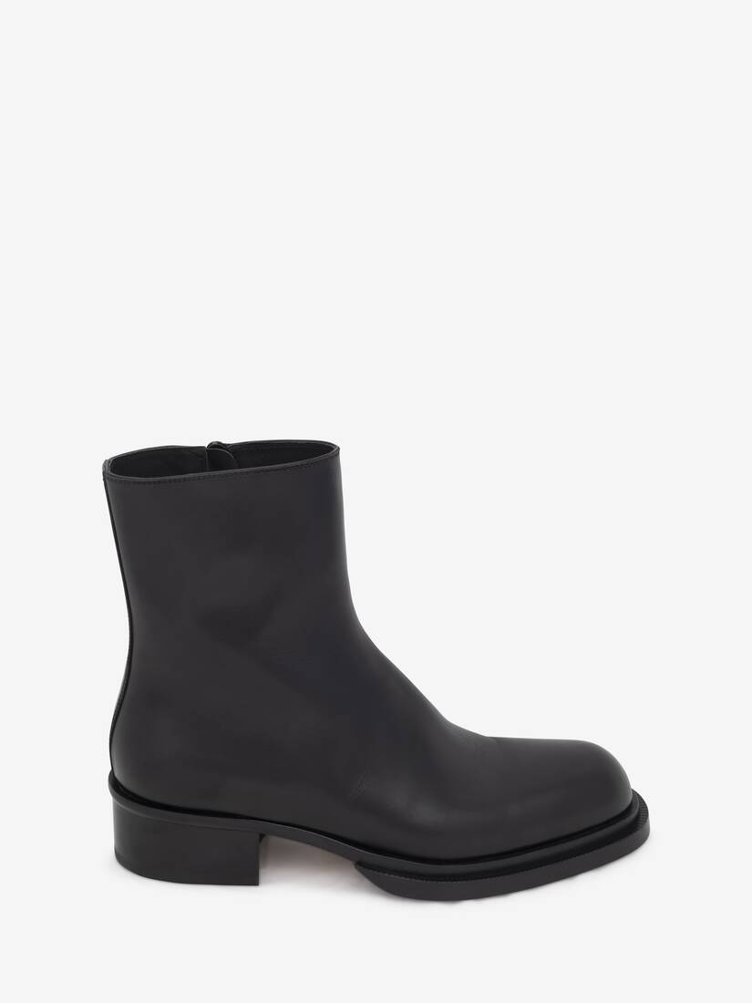 Cuban boot in black calf leather featuring a double stacked sole. The boot is finished with a side zip fastening and the Alexander McQueen signature embossed on the outsole. Product Details: • Round toe • Embossed Alexander McQueen signature on the outsole • Side zip fastening • Heel height: 45mm Material:100% Calf Leather Product Code:750383WIDY01000