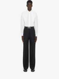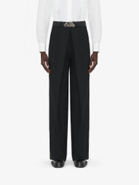 Deep pleat tailored trousers in black wool gabardine. The trousers feature two side pockets and two welt pockets on the back. Finished with a concealed zip and hook fastening. Product Details: • Belt loops • Side pockets • Concealed zip and hook fastening • Made with certified wool yarn Material:100% Wool Product Code:758702QVU821000