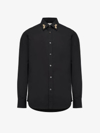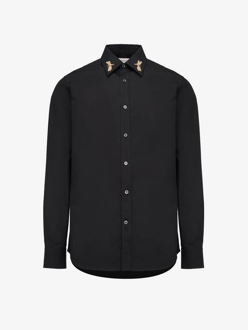 Black cotton poplin shirt detailed with a gold-tone Dragonfly embroidery on each side of the collar. The shirt features a curved hem and is finished with a button fastening. Product Details: • Point collar • Front button fastening • Regular fit • Made with organic cotton yarn Material:100% Cotton Product Code:774943QNAAD1000