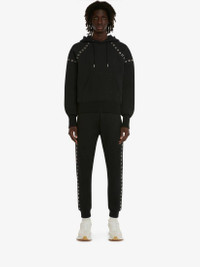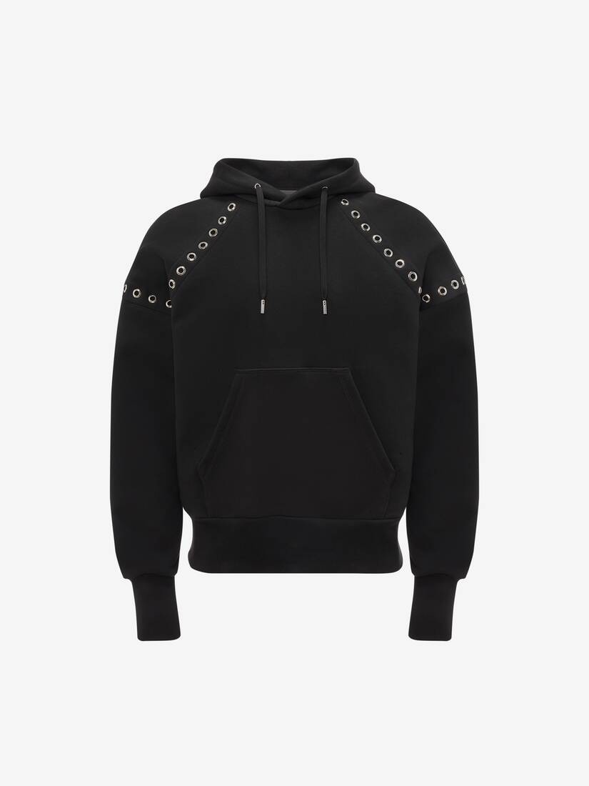 Black hooded sweatshirt in cotton compact loopback jersey with silver-tone metal eyelets detailing on the shoulders, creating the shape of a harness. The sweatshirt features a drawstring hood and a front pocket. Finished with tonal ribbed-knit cuffs and hem. Oversize fit. • Made with organic cotton