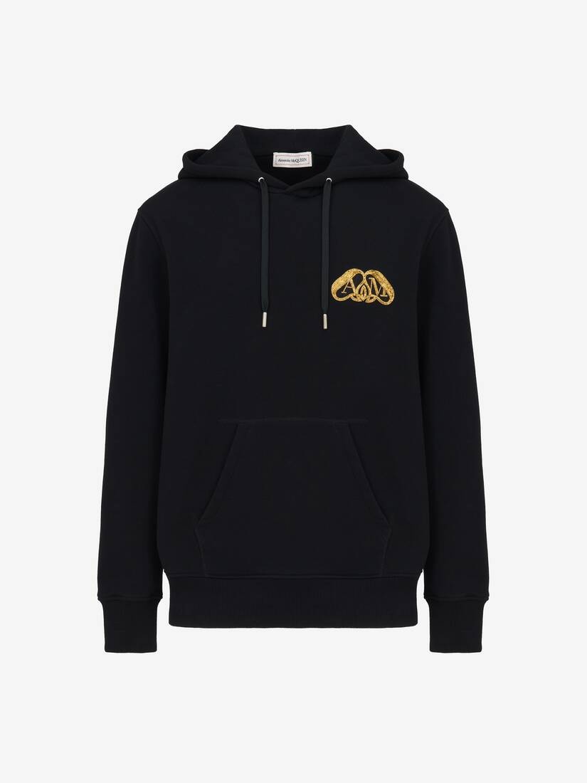Hooded sweatshirt in black loopback fleece with a gold hammered Half Seal Logo applique. The sweatshirt features a front pocket and a drawstring hood. Finished with ribbed cuffs and hem. Product Details: • Crew neck • Dropped shoulders • Ribbed trims • Made with organic cotton yarn Material:100% Cotton Product Code:781955QXAAG1000
