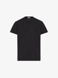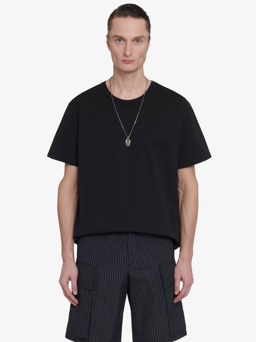 Hybrid crew neck T-shirt in black cotton jersey and black and white pinstripe shirting featuring a tonal Alexander McQueen logo embroidery. The shirt is finished with drawstring detailing on the back. Product details - Crew neck - Short sleeves - Drawstring on the back - Made with organic cotton yarn - Product code: 792219QXAAF1000 - Made in Italy