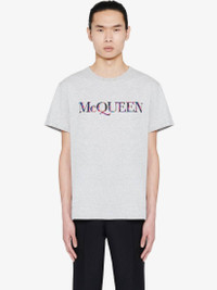 Pale grey cotton jersey T-shirt with a seasonal McQueen logo print on the chest. The T-shirt features a crew neck and is cut for a regular fit. Product Details: • Crew neck • Regular fit • Made with organic cotton yarn Material:100% Cotton Product Code:759451QVZ320902