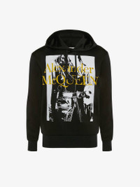 Black loopback viscose hooded sweatshirt detailed with the Atelier print. The style features a drawstring hood and ribbed-knit trims. Finished with a printed Alexander McQueen logo. Material:51% Viscose, 43% Cotton, 6% Polyamide Product Code:711147QTZ450901