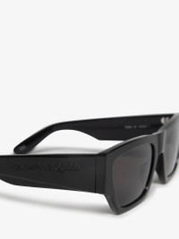 Shiny black acetate McQueen Angled sunglasses featuring a masculine rectangular construction with smoke lenses. Finished with a tonal Alexander McQueen logo on both temples. All Alexander McQueen Eyewear is 100% certified UV protective (UVA and UVB rays). This frame can be fitted with prescription lenses. Material:100% Acetate Product Code:744510J07491056
