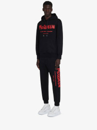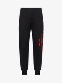 Black loopback jersey joggers detailed with a screen printed McQueen Graffiti logo. The sweatpants have two side pockets, an elasticated waist and hem. Finished with a concealed zip fly and internal drawstrings. Product details - Elasticated waist and hem - Side pockets - Concealed zip fly - Made with organic cotton yarn - Product code: 688714QTAAB0509 - Made in Italy