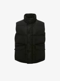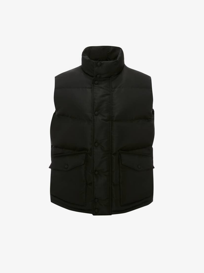 Black polyfaille puffer waistcoat, featuring a shiny tonal McQueen Graffiti print on the back. The jacket has front pockets with silver-finished zip fastenings. Finished with concealed snap buttons and a zip fastening on the centre front. Material:100% Polyester Product Code:682881QSR771000