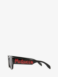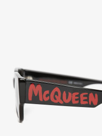 Shiny black acetate sunglasses featuring a rectangular construction with smoke lenses. Finished with a contrasting red McQueen Graffiti printed signature on one temple only. All Alexander McQueen Eyewear is 100% certified UV protective (UVA and UVB rays). Material:100% Acetate Product Code:669322J07401074