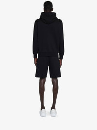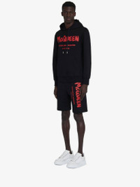 Black loopback jersey shorts featuring a screen printed red McQueen Graffiti logo. The shorts are detailed with an elasticated waistband, two side pockets and a zipped pocket on the back. Product details - Elasticated waistband - Side pockets - Zipped pocket on the back - Made with organic cotton yarn - Product code: 688717QTAAB0509 - Made in Italy