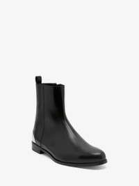Black smooth leather boot featuring an almond toe and a silver-finished metal plate on the heel counter, engraved with the Alexander McQueen logo. The boot is finished with a side zip fastening. Product Details: • Zip closure • Almond toe • Engraved metal plate • Leather sole • Sole height: 30mm Material:100% Calf Leather Product Code:777947WIES31081