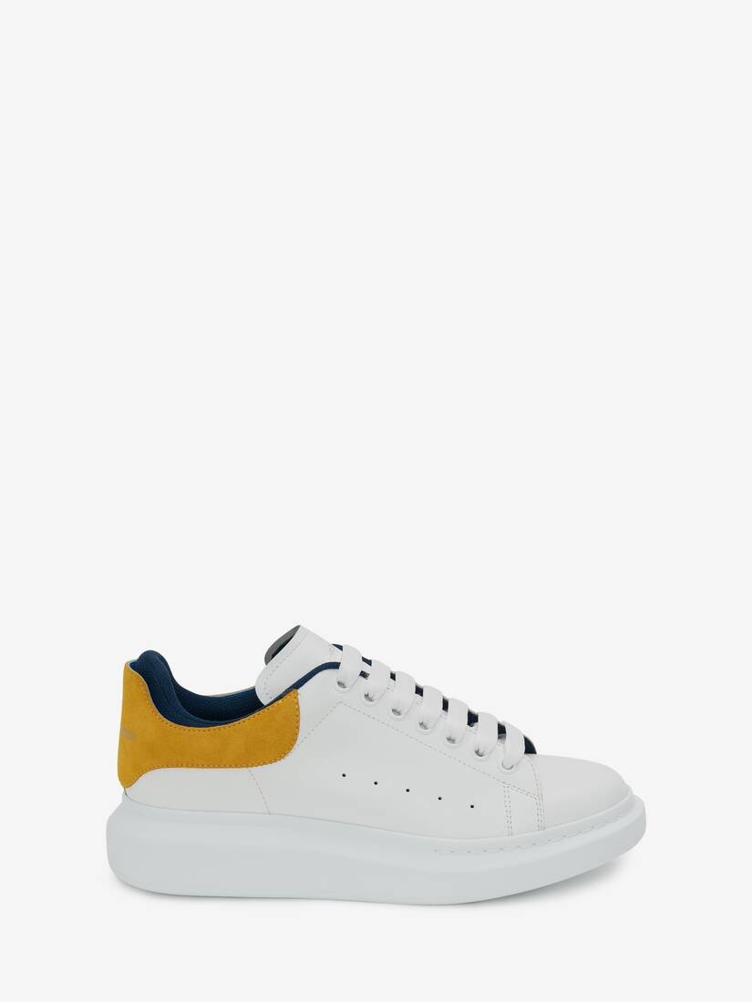White smooth calf leather lace-up sneaker with a rounded toe and trimmed with pop yellow suede and navy blue summer lining. Large flat laces and Alexander McQueen signature on tongue and heel counter. Oversized rubber sole. The sneaker comes with fleck and white shoelaces. To lessen our environmental impact and to reduce cotton consumption, we will no longer be providing a dust bag with our sneakers. Material:100% Calf leather Product Code:705060WIBNT8998