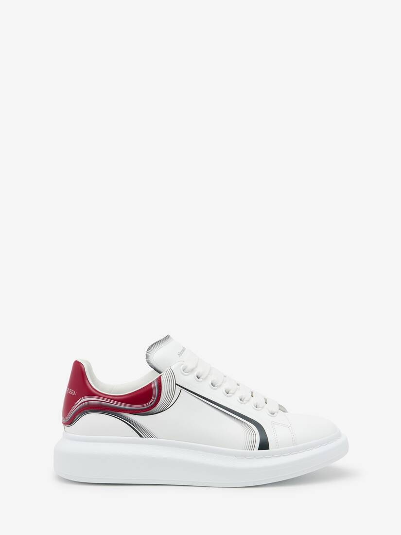 Presented in white calf leather, this Oversized Sneaker is detailed with a garnet and black Curve Tech print on the sides and heel counter. The sneaker is finished with the Alexander McQueen signature and a chunky rubber sole. Product Details: • Round toe • Alexander McQueen signature • Curve Tech print on the sides and heel counter • Oversized rubber sole • Additional pair of shoelaces included • To lessen our environmental impact and to reduce cotton consumption, we will no longer be providing a dust bag with our sneakers. Material:100% Calf Leather Product Code:750336WIDJM8835