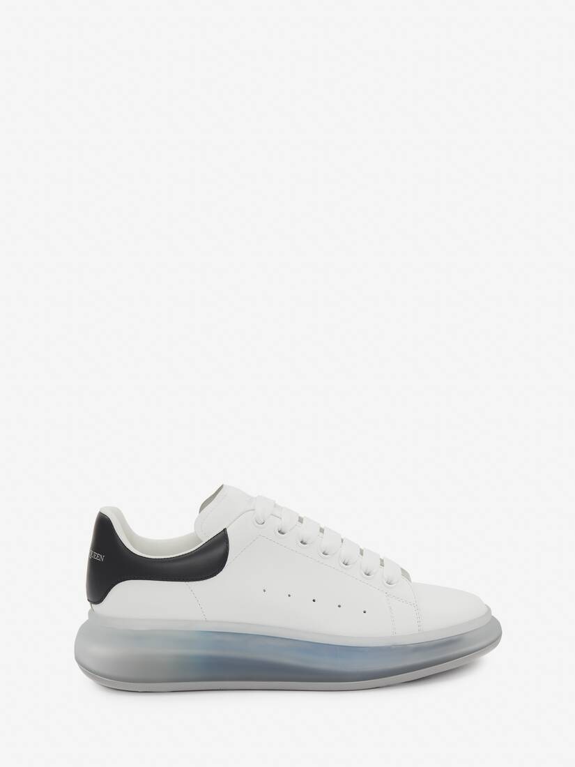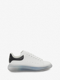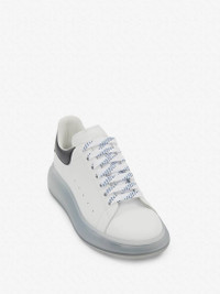 White and navy calf leather lace-up sneaker featuring an oversized frosted transaparent sole and color island inside. Finished with an Alexander McQueen signature on tongue and heel counter. The sneaker comes with an additional set of white shoelaces. To lessen our environmental impact and to reduce cotton consumption, we will no longer be providing a dust bag with our sneakers. Material:100% Calf leather Product Code:709817WICY19095