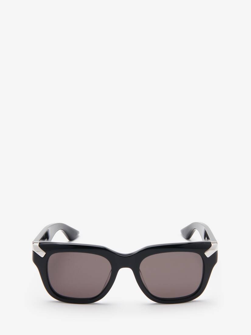 Black sunglasses fitted with solid smoke lenses. The sunglasses have a square shape and are detailed with two silver metal rivets on the front. Finished with a tonal engraved Alexander McQueen signature on the temples. All Alexander McQueen Eyewear is 100% certified UV protective (UVA and UVB rays). This frame can be fitted with prescription lenses. Product details - The style is made with Eastman Acetate Renew, an acetate alternative with 27% recycled content - Product code: 781942J07491056 - Made in Italy - Material: Acetate