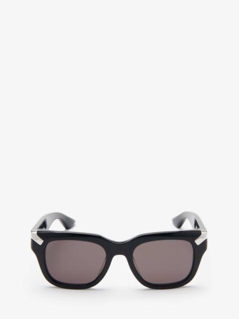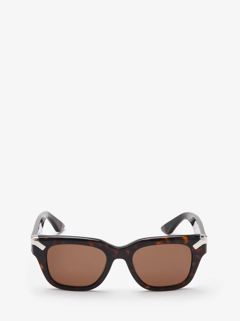 Dark havana sunglasses fitted with solid brown lenses. The sunglasses have a square shape and are detailed with two silver metal rivets on the front. Finished with a tonal engraved Alexander McQueen signature on the temples. All Alexander McQueen Eyewear is 100% certified UV protective (UVA and UVB rays). This frame can be fitted with prescription lenses. Product details - The style is made with Eastman Acetate Renew, an acetate alternative with 27% recycled content - Product code: 781942J07492305 - Made in Italy