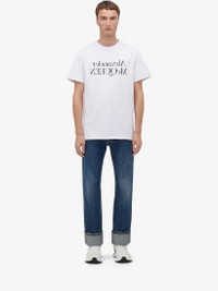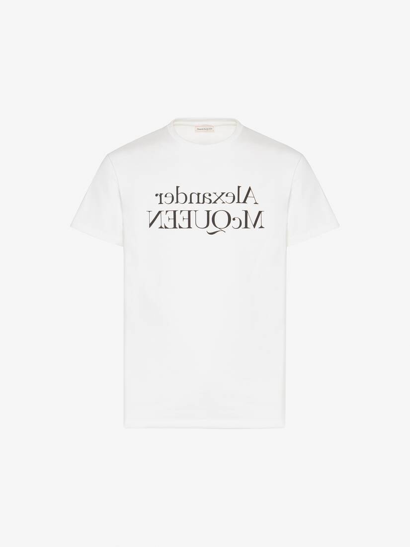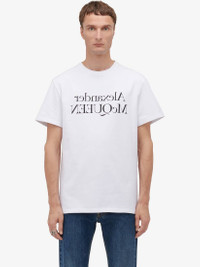White medium-weight cotton jersey crew neck T-shirt featuring a black reflected Alexander McQueen logo across the chest. The T-shirt is cut for a regular fit. Product Details: • Crew neck • Short sleeves • Regular fit • Made with organic cotton yarn Material:100% Cotton Product Code:781977QTAAZ0909