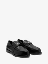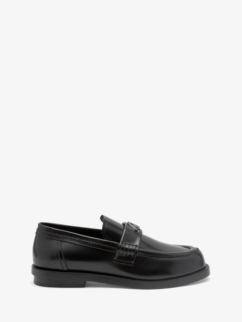 Black leather loafer featuring a small gunmetal-finished Seal Logo plaque. The loafer features a round toe and thick chain stitching. Finished with a stacked, flexible leather sole. Product Details: • Round toe • Small Seal Logo plaque • Stacked leather sole • Sole height: 30mm Material:100% Calf Leather Product Code:777805WIES21069