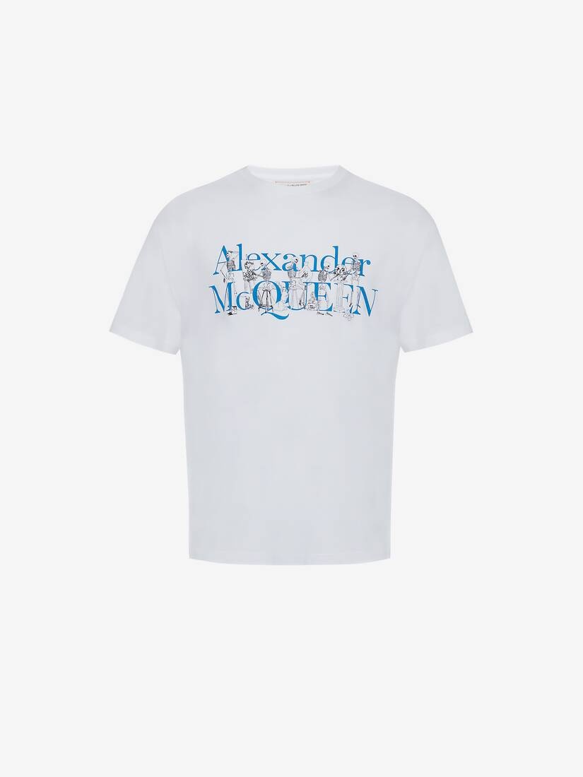 White cotton jersey T-shirt detailed with a Skeleton Band print intertwined with the Alexander McQueen signature. The style features a crew neck and short sleeves. Regular fit. Material:100% Cotton Product Code:735279QUZ480900