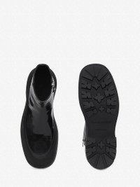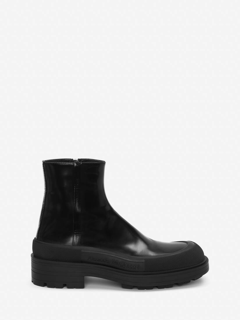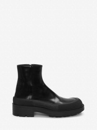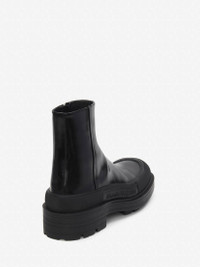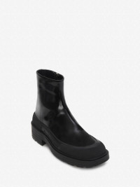 Black leather boot featuring a stacked rubber sole. The boot is detailed with a textured rubber wrap and tonal Alexander McQueen signature. Finished with a silver-tone metal zip fastening. Material:100% Calf Leather Product Code:735809WHV7H1000