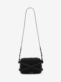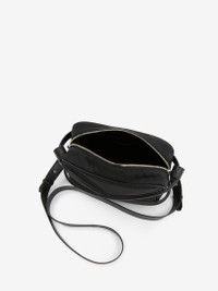 Black nylon camera bag detailed with a tonal harness. Finished with an Alexander McQueen signature at the base. Product details - Top double zip closure - External back pocket - Internal phone pocket - Detachable and adjustable crossbody leathereffect strap - Hardware with shiny silver finishing - Product code: 7262921AALD1000 - Made in Italy