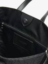 Black nylon shopper detailed with an all-over tone on tone McQueen Graffiti print and a tonal leather harness. The bag can be worn either hand-held , over the shoulder or across the body using its detachable leather strap. Product Details: • Dimensions: Lenght 37 x Height 40 x Depth 11.5 cm • Handles: 10 cm • Strap: 38 - 47 cm • Magnetic fastening • One main compartment • Internal tonal black nylon lining • Internal zip pocket and leather card holder • Detachable and adjustable leather strap • Eco brass hardware with shiny silver finishing • Nylon lining Material:100% Polyester Product Code:7747671AAQ01000