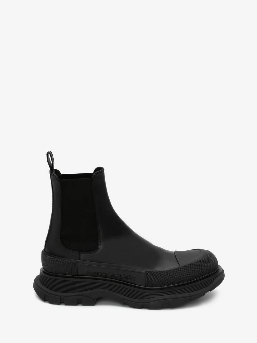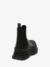 Black calf leather Chelsea boot with an oversized rubber tread sole. The boot is detailed with a textured rubber wrap and tonal Alexander McQueen signature, finished with a signature ribbon on the back of boot. Round-toe boot silhouette with rubber toe cap detail. Material:100% Calf Leather Product Code:705672WHZ611081