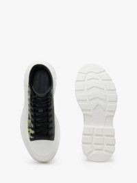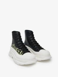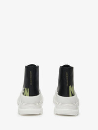 Presented in black calf leather, this Tread Slick boot features a khaki printed McQueen Graffiti logo. The boot is detailed with a textured rubber wrap and a tonal Alexander McQueen signature. Finished with a lightweight oversized rubber tread sole. Product Details: • Lace-up closure • Round toe • Textured rubber wrap • Foil signature on the back • Oversized rubber tread sole • Sole height: 45mm • Additional pair of shoelaces included Material:100% Calf Leather Product Code:777960WIAT61680