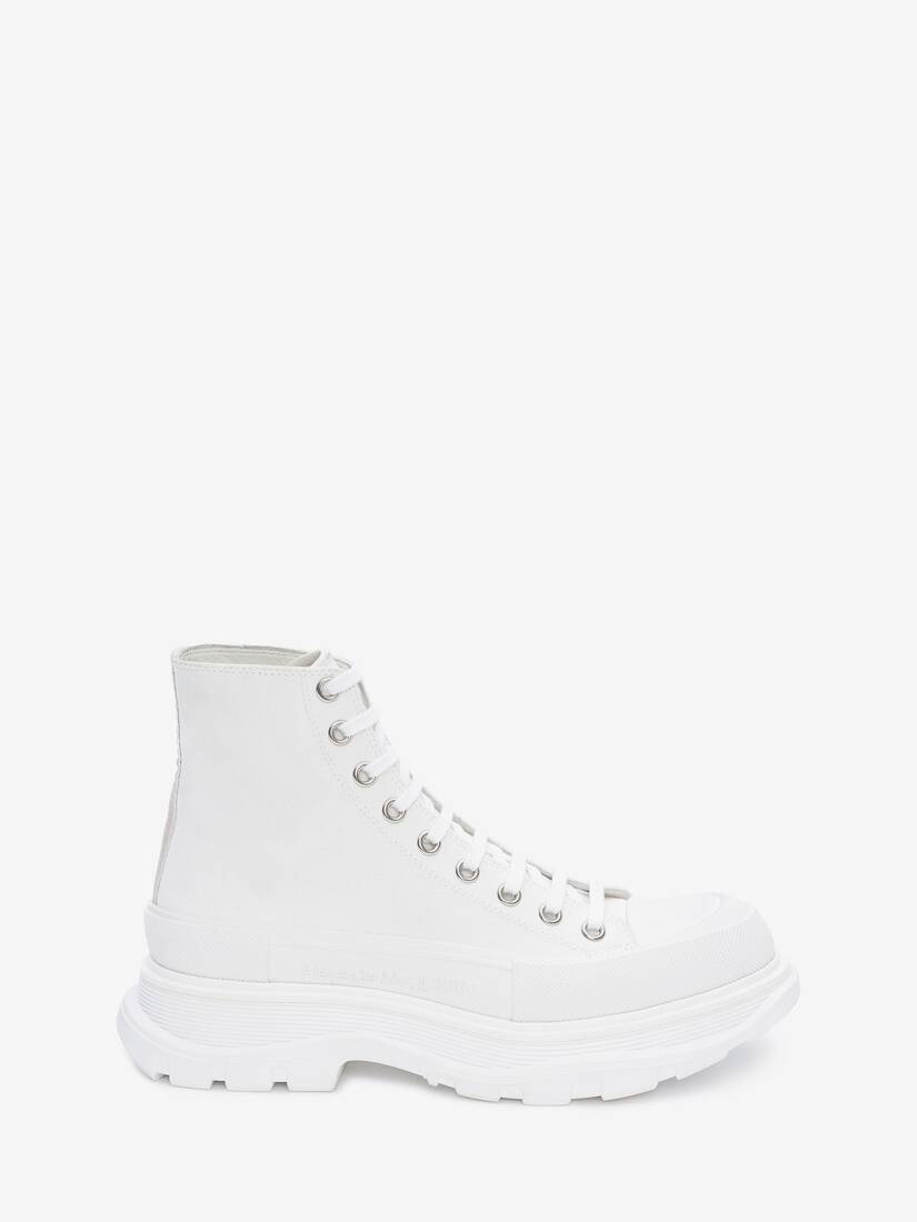White canvas lace-up boot with a thick oversized rubber tread sole. The boot is detailed with a textured rubber wrap and tonal Alexander McQueen signature, finished with a signature ribbon on the back of boot. Round toe shape boot silhouette details rubber toe cap. Product details - Please note, standard Alexander McQueen packaging is not available on employee sale purchases. - All sales are final and may not be returned or exchanged. Some products may present slight imperfections and all products are sold on an “as is”, final sale basis. - All products purchased by the employees are strictly personal and may not be resold. Failure to comply with the Policy will result in serious disciplinary measures. - Product code: 705659W4MV29000 - Made in Italy - Material: Cotton
