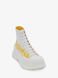 White leather lace-up boot featuring a contrast McQueen Graffiti print with an oversized rubber tread sole. The boot is detailed with a textured rubber wrap and tonal Alexander McQueen signature, finished with a signature ribbon on the back of boot. Round toe shape boot silhouette detailed with rubber toe cap. Comes with two sets of white laces. Material:100% Calf Leather Product Code:711109WIAT69429